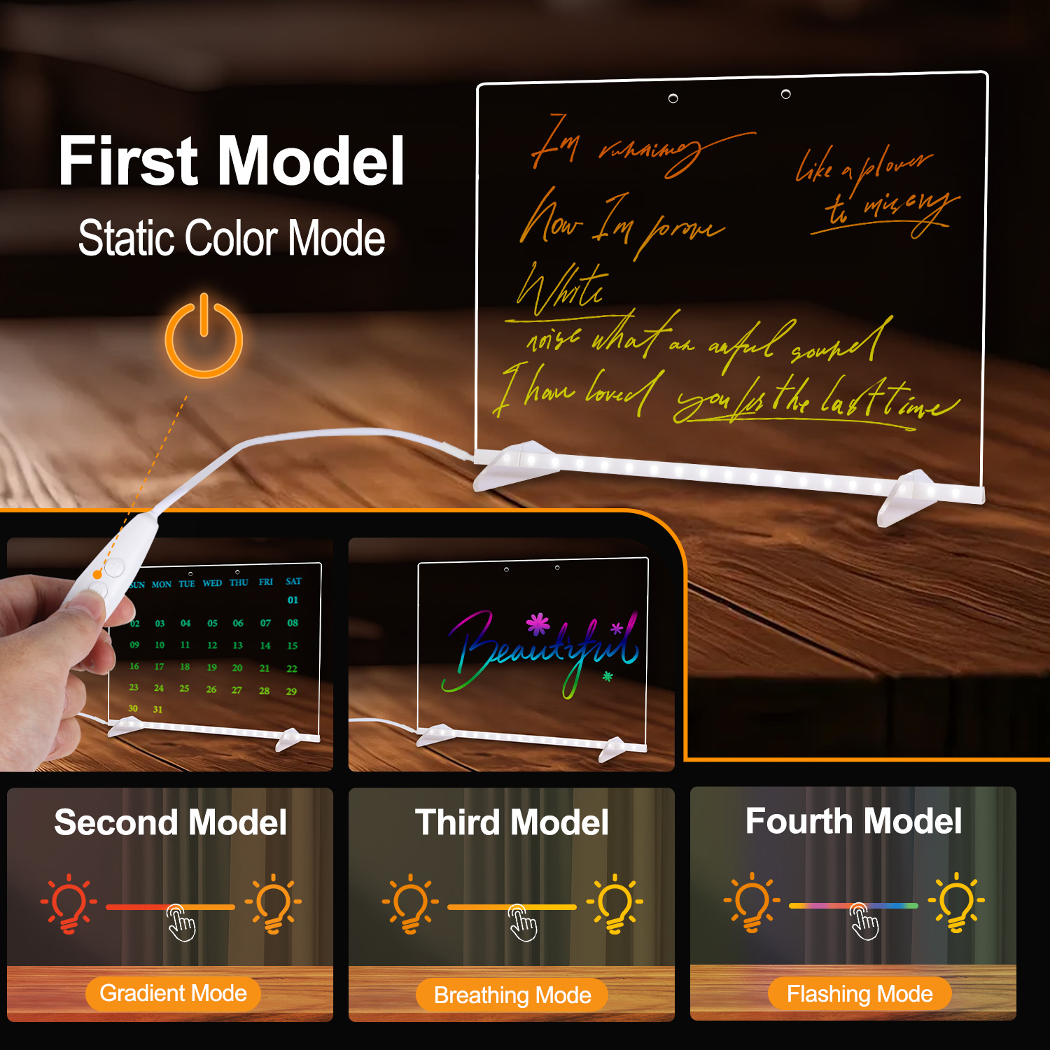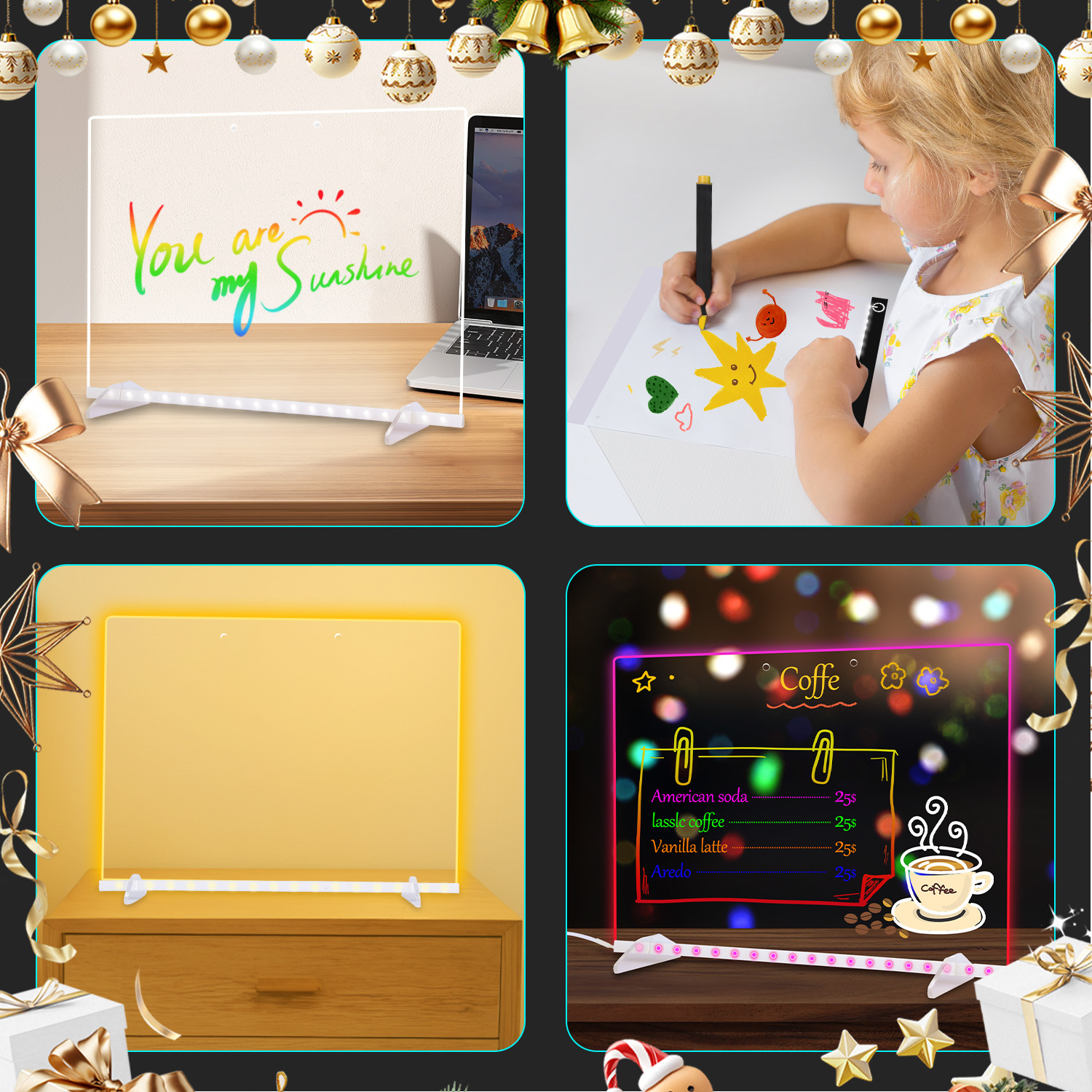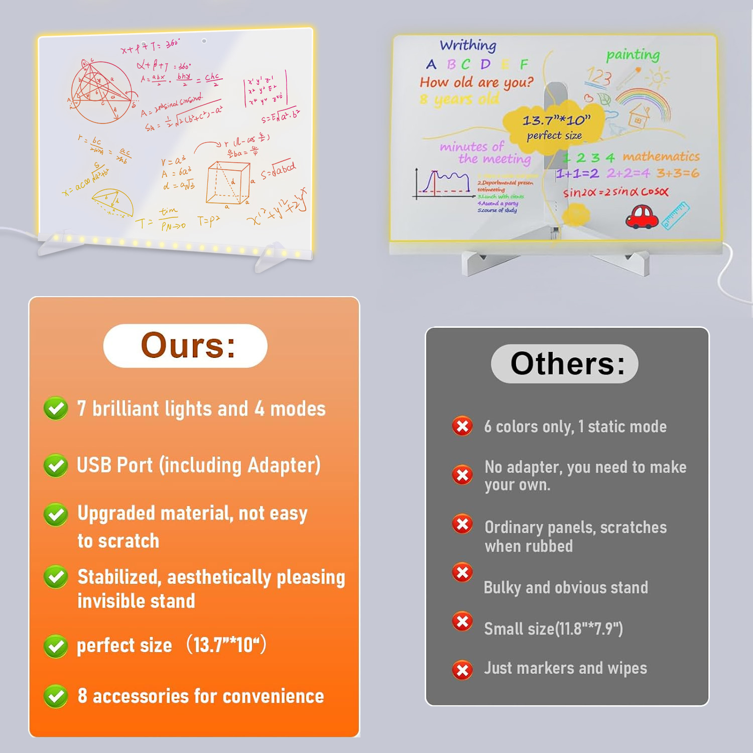 - Elevate your creativity and communication with the 13.7" x 10" LED Drawing Board, featuring 7 vibrant LED colors and 4 dynamic lighting modes (static, jump, flashing, fading) to make your notes, doodles, or reminders come alive with glowing detail.
