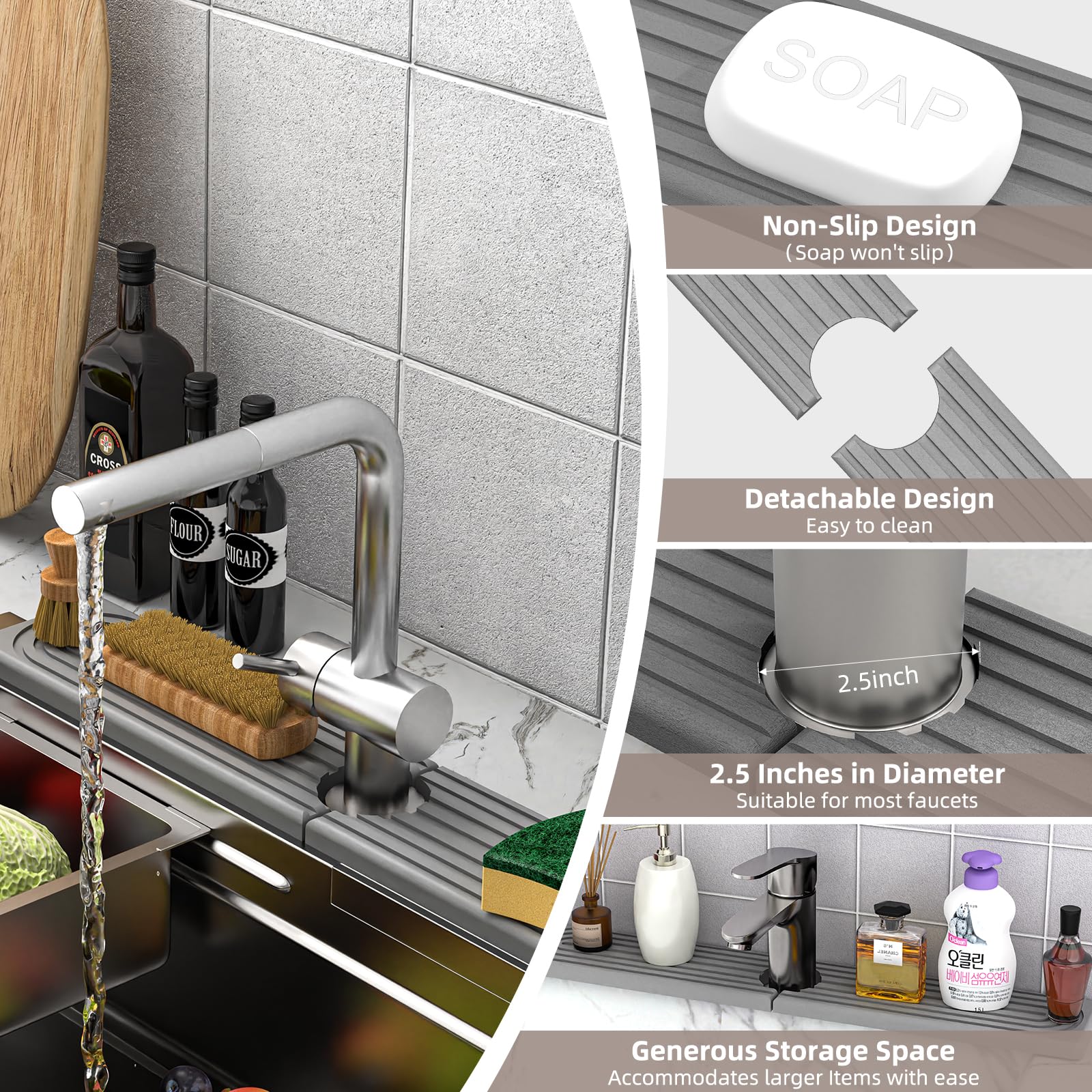 - 【Sink Mat & Organizer】 This mat not only absorbs water around the faucet but also holds soap, toothbrushes, cups, dish sponges, and other items that need to be dried. Say goodbye to stains on faucets and keep your countertops clean and dry.