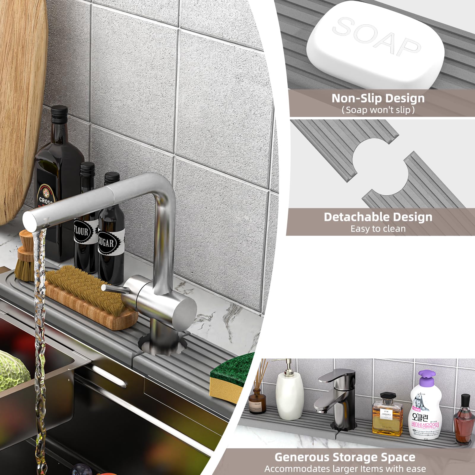 • 【Sink Mat & Organizer】 This mat not only absorbs water around the faucet but also holds soap, toothbrushes, cups, dish sponges, and other items that need to be dried. Say goodbye to stains on faucets and keep your countertops clean and dry.